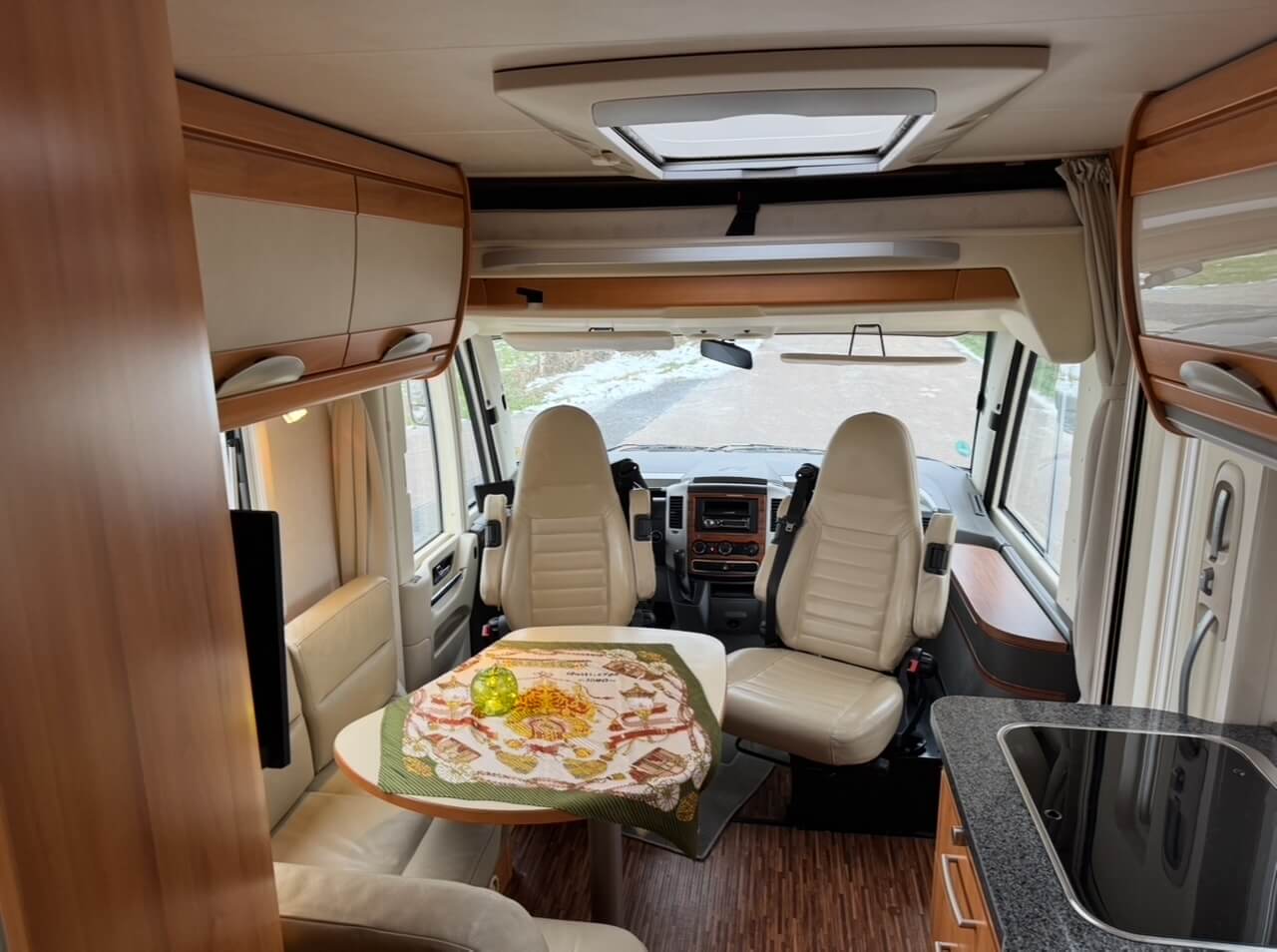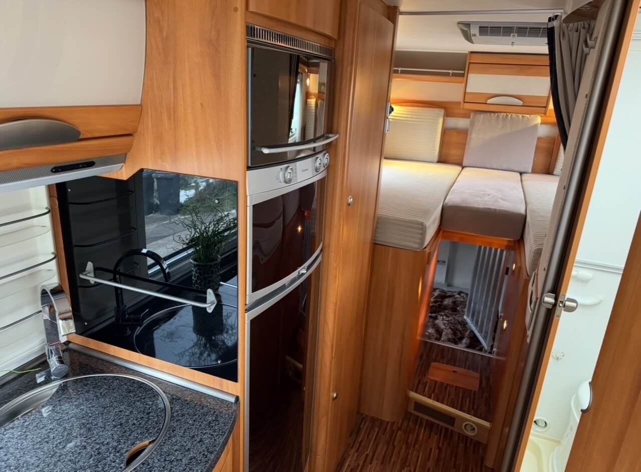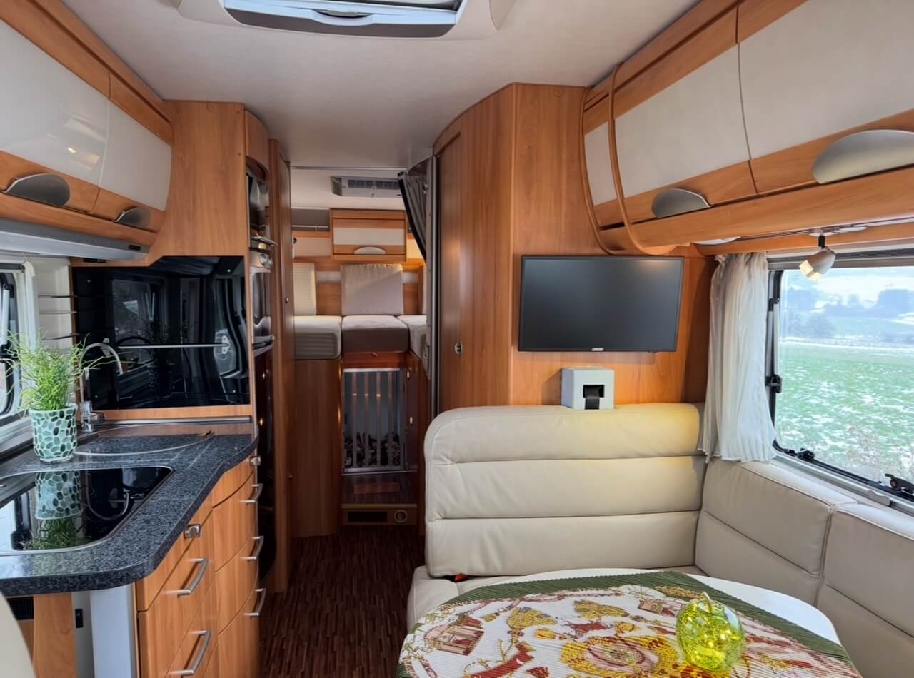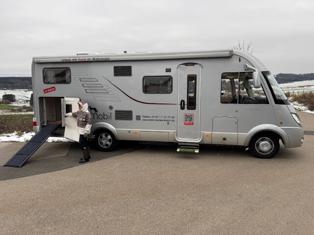 Waumobil Don ist ein komfortables Wohnmobil Hymer B 675 SL auf Mercedes-Basis, das speziell für Hundebesitzer ausgestattet ist. In der großen, von außen und innen zugänglichen Heckgarage befindet sich eine extra große Hundebox, ideal auch für Mehrhundebesitzer. Dank hochwertigem Hymer-Aufbau und guter Isolierung eignet sich Don hervorragend für Winterurlaub, bietet viel Stauraum, gemütlichen Wohnkomfort und eine sichere, entspannte Reise für Mensch und Hund.