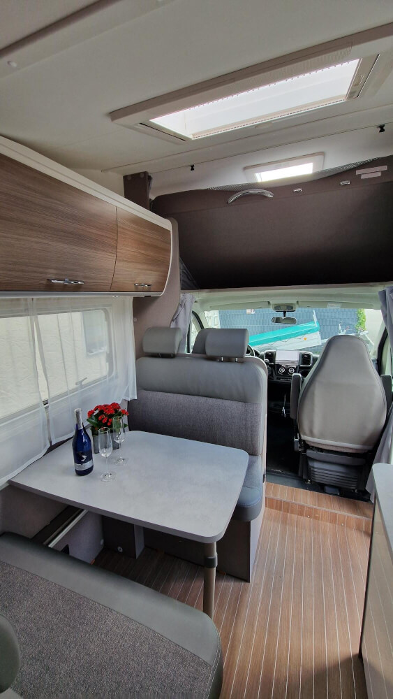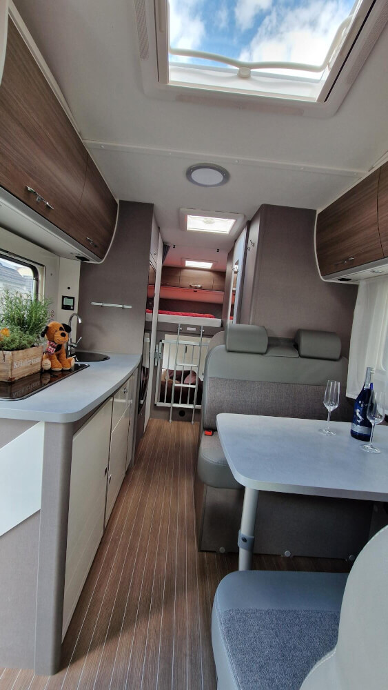 Mit diesem Fahrzeug können nun auch Familien mit erhöhtem Platzbedarf ein Angebot machen. Das Alkovenfahrzeug hat einen intelligenten Grundriss und erstaunlich viel Platz. Die praktische Face to Face Sitzgruppe bietet Platz zum spielen, essen, schlafen. Im Wohnmobil ist ein großes Bad/WC, ein Heckbett, der kuschlige Alkoven wird von Kindern zur Höhle umgerüstet und geliebt. Im großzügigem Küchenbereich findet sich ein benutzerfreundlicher 3 -Flammen Gasherd, ausreichend Arbeitsfläche und ein großer Kühlschrank mit separatem Eisfach